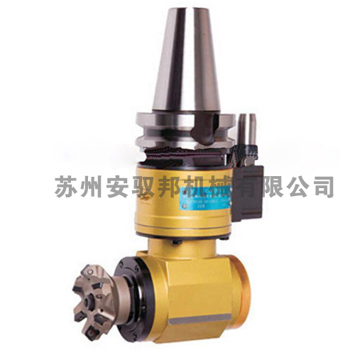 角度頭是一種機(jī)床附件,機(jī)床安上角度頭后刀具旋轉(zhuǎn)中心線可以與主軸旋轉(zhuǎn)中心線成角度加工工件。原產(chǎn)于歐洲,現(xiàn)已廣泛應(yīng)用于航空、汽車、模具等機(jī)械加工的各個(gè)領(lǐng)域。使用角度頭,無需改變機(jī)床結(jié)構(gòu)就可以增大其加工范圍和適應(yīng)性,使一些用傳統(tǒng)方法難以完成的加工得以實(shí)現(xiàn),并能減少工件重復(fù)裝夾,提高加工精度和效率。主要用于立式或臥式加工中心、鏜床、龍門銑床等,其中輕型可以裝在刀庫中,并可以在刀庫和機(jī)床主軸之間自由轉(zhuǎn)換;中型及重型擁有較大的剛性和扭矩,可適用于重切削加工需求。因角度頭擴(kuò)充了機(jī)床的使用性能,相當(dāng)于給機(jī)床增加了一根軸,甚至在某些大型工件不易翻轉(zhuǎn)或是高精度要求的情況下,比第四軸更實(shí)用。 FM型面銑刀專用小型90度直角銑頭它的特點(diǎn)是具備傳統(tǒng)角度頭的特點(diǎn),本體與角度頭可360度自由回轉(zhuǎn);可直接連接面銑刀,加工快速穩(wěn)定;可自動(dòng)換刀,是提高效率、批量生產(chǎn)必備的工具。